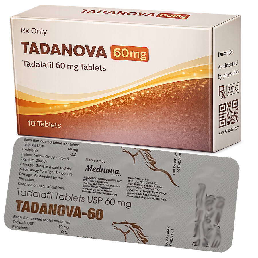 Tadanova 60mg (Tadalafil) je vyrábaný spoločnosťou Mednova Pharmaceuticals a je to najobľúbenejší náhrada (generikum) Cialisu (Tadalafil). Tadarise je liek pre mužov ktorí trpia poruchami erekcie alebo ak erektilnou dysfunkciou a po jej užití je možné prakticky každému mužovi dosiahnuť kvalitné erekcie a teda si užiť lepší sexuálny styk.Tadarise (Tadalafil) môže účinkovať až 36 hodín, to je oveľa dlhšie, než Viagra (Sildenafil) alebo ostatné prípravky obsahujúce látku Sildenafil citrate. Z tohto dôvodu je často nazývaný “víkendové tableta”. Vďaka dlhotrvajúcemu účinku sa Tadanova (Tadalafil) stal najviac predpisovaným liekom na liečbu erektilnej dysfunkcie. Tadanova obsahuje látku Tadalafil, ktorá stimuluje prekrvenie penisu čím pri sexuálnej stimulácii dochádza k lepšej a pevnejšie erekciu. Tadanova (Tadalafil) tiež pomáha udržať kvalitnú dlhotrvajúcu erekciu. Tadanova (Tadalafil) účinkuje už cca po 30 minútach od užitia a jeho účinok trvá až 36 hodín. Tadanova (Tadalafil) sa stal v posledných rokoch takmer najobľúbenejším liekom na poruchy erekcie.
