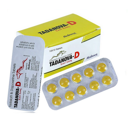 Tadanova D Last Long 80mg je vylepšený generický Cialis 20mg o 60mg Dapoxetine, teda ako dva lieky v jednej tablete. Dapoxetine je už dlho účinným liekom predčasnej ejakulácie a lepšej kontroly nad predčasnou ejakuláciou. Tadanova D 80mg úspešne lieči impotenciu a problémy s erekciou (erektilnej dysfunkcii) a po jeho užití je umožnené skoro každému mužovi dosiahnuť veľmi kvalitné a dlhotrvajúce erekcie a užiť si tak lepšie a dlhší sexuálny styk. Tadanova D 80mg obsahuje látku Tadalafil, ktorá veľmi dobre stimuluje prekrvenie penisu a tým pomáha k ľahkému a rýchlemu dosiahnutiu kvalitnej erekcie a látku Dapoxetine, ktorá úspešne pomáha v boji proti predčasnej ejakulácii. Tadanova D 80mg účinkuje cca po 30-60 minútach od užitia a jeho účinok trvá až 36 hodín. Tadanova D 80mg je obľúbeným liekom na liečbu erektilnej dysfunkcie a predčasnej ejakulácie.